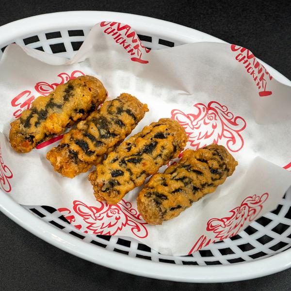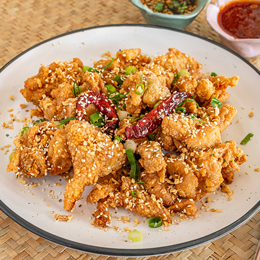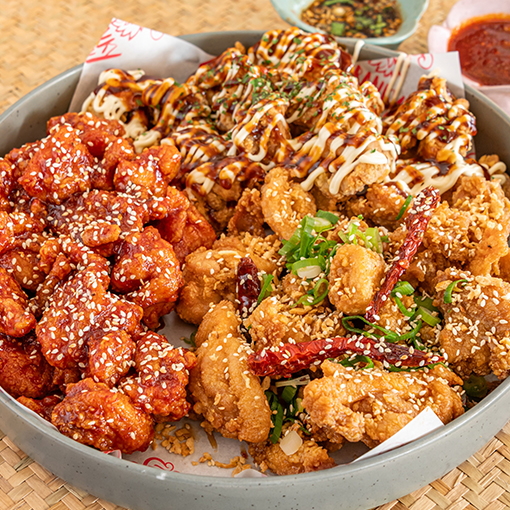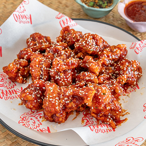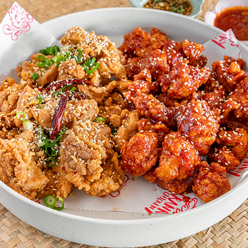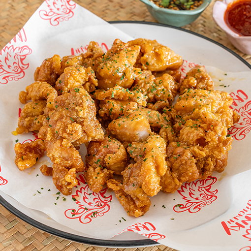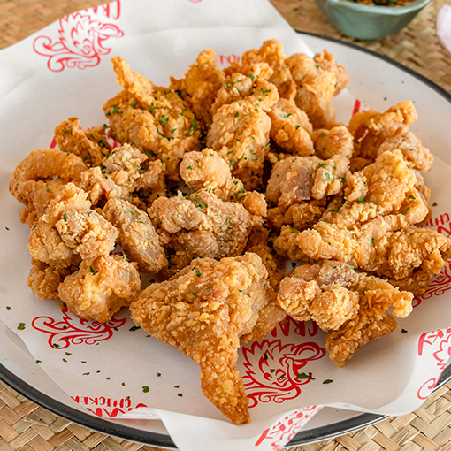 This chicken style uses premium boneless thigh meat, offered in Snack and Regular portions. Snack is a single serving and Regular is generous or one very hungry person. For family feasts, we offer Half/Half and Triple platters.