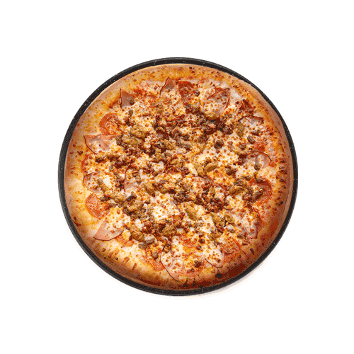 Pizza sauce, Ham, Bacon, Beef, Pepperoni, Sausage, Mozzarella, BBQ sauce swirlPIZZA BASE