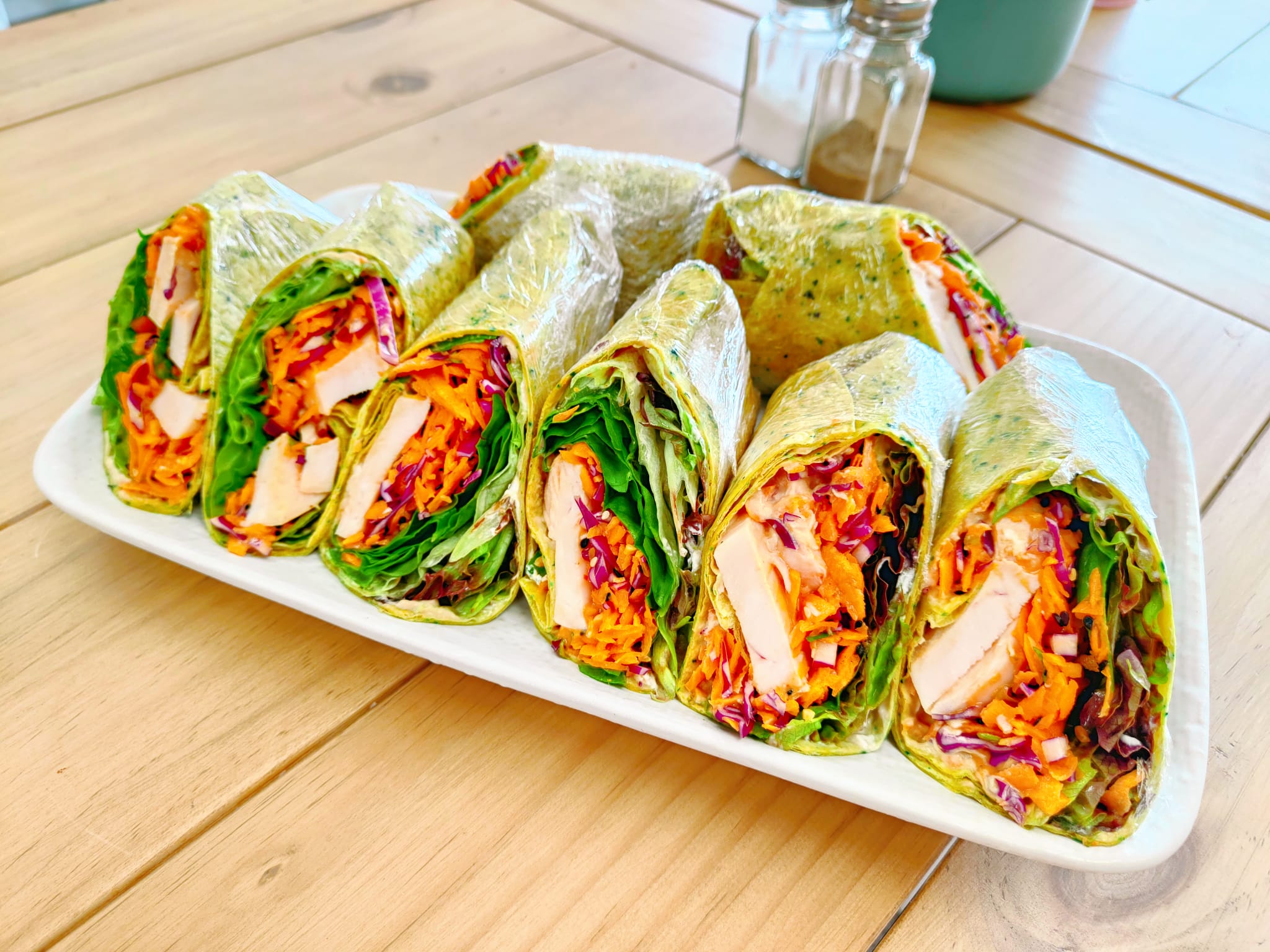 These Wraps are super tasty with Hummus, Tzatziki, Tomato Relish Lettuce, Sesame Slaw, Peppers & Sauerkraut. Filling and great for lunch or dinner.0