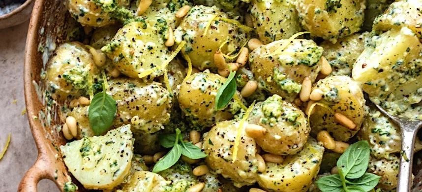Blend potato, gherkin, olive oil and basil pesto ~ NOW MADE WITHOUT NUTS~SALAD PROTEIN ADDITIONS