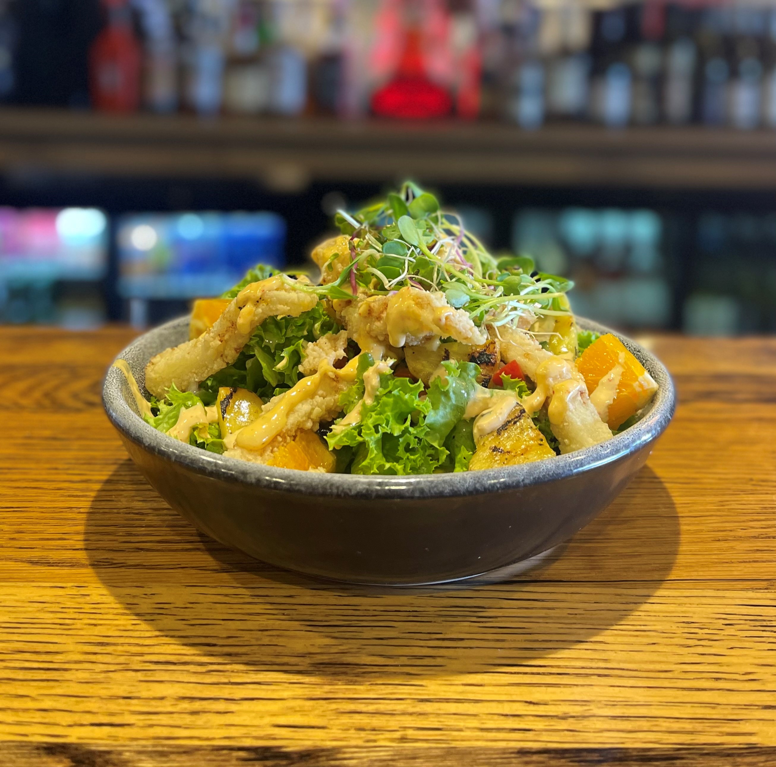 CALAMARI SALAD$31Crispy fried lemon pepper calamari pieces, served on crisp lettuce with grilled pineapple & orange salsa topped with kimchi mayoSIDES