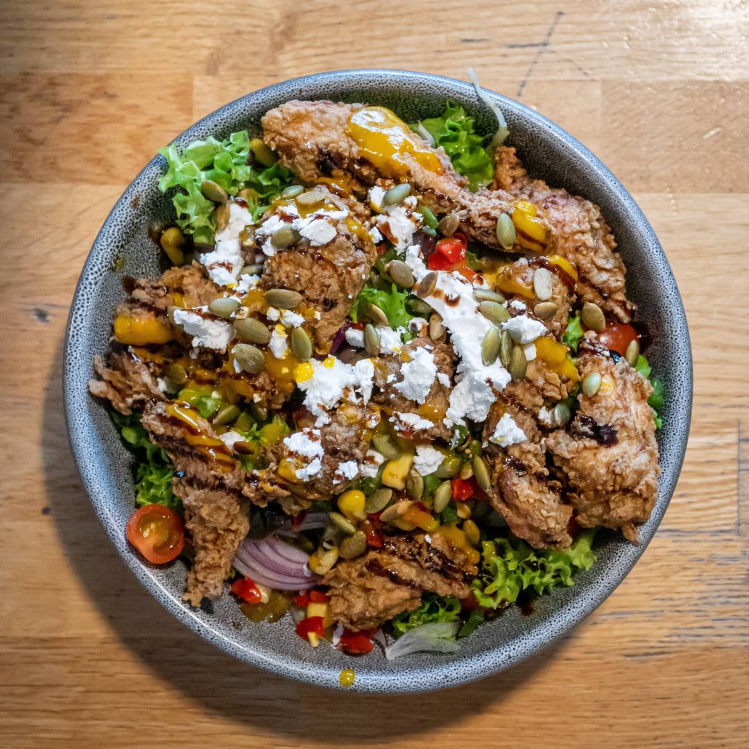 CRISPY SPICED CHICKEN SALAD$28Tender and crispy jerk chicken, served on salad greens, tomato’s, salsa, red onion, pumpkin seeds, jalapenos, feta & mango dressing