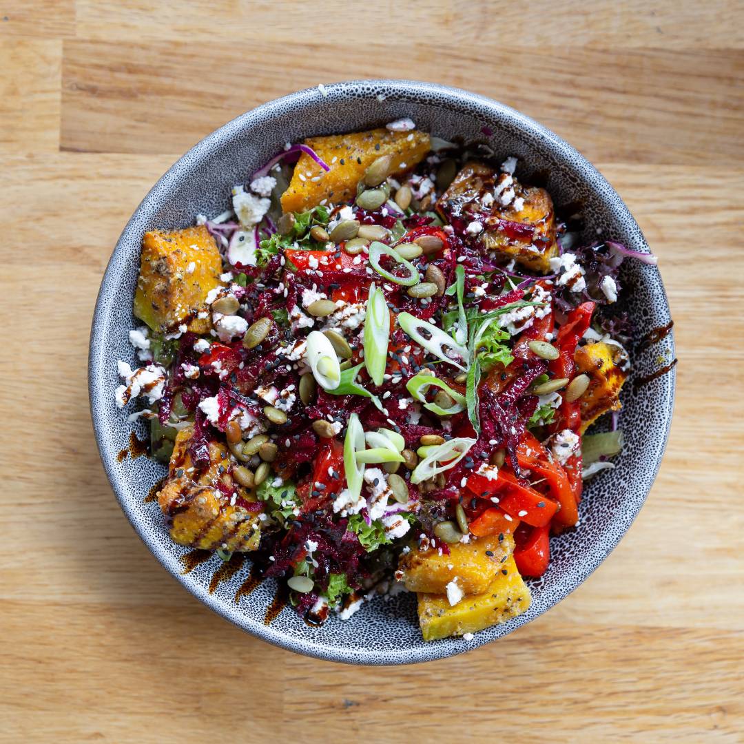 Roasted pumpkin, feta, roasted capsicum, shredded beetroot, tossed in a green salad with a vinaigrette dressing & topped with toasted seeds.ADD CHICKEN?